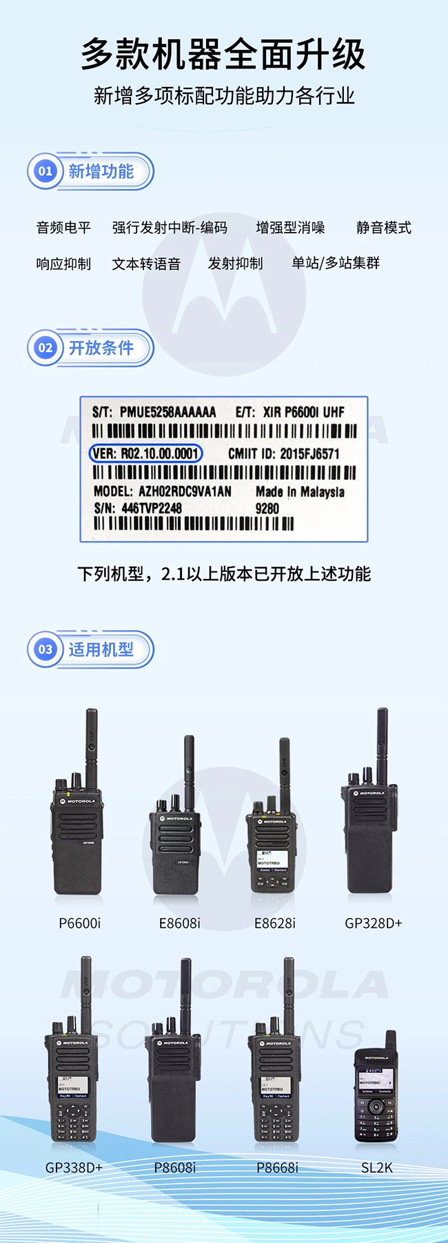 從2019年第四季度開始,我司經(jīng)銷的多款摩托羅拉對(duì)講機(jī)新版機(jī)器在出廠時(shí),有些功能已經(jīng)免費(fèi)開通供客戶使用了,其中包括:音頻電平、強(qiáng)行發(fā)射中斷-編碼、增強(qiáng)型消噪、靜音模式、文本轉(zhuǎn)語音、發(fā)射抑制、響應(yīng)抑制和單站/多站集群。