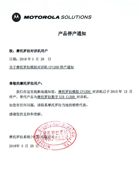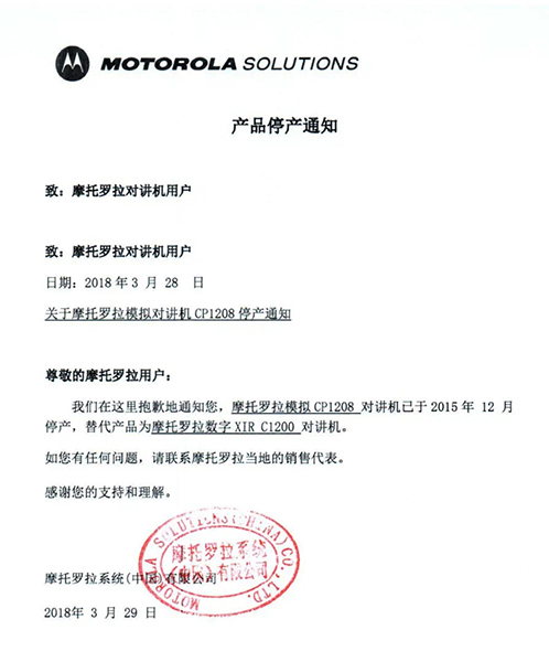 摩托羅拉系統(tǒng)根據(jù)國(guó)家相關(guān)要求,已于2015年逐步停止了模擬機(jī)全球工廠的生產(chǎn),同時(shí)按照國(guó)家有關(guān)規(guī)定,相關(guān)機(jī)型的《無(wú)線電發(fā)射設(shè)備型號(hào)核準(zhǔn)證》及《防爆電氣設(shè)備防爆合格證》均已不再辦理延期手續(xù)。